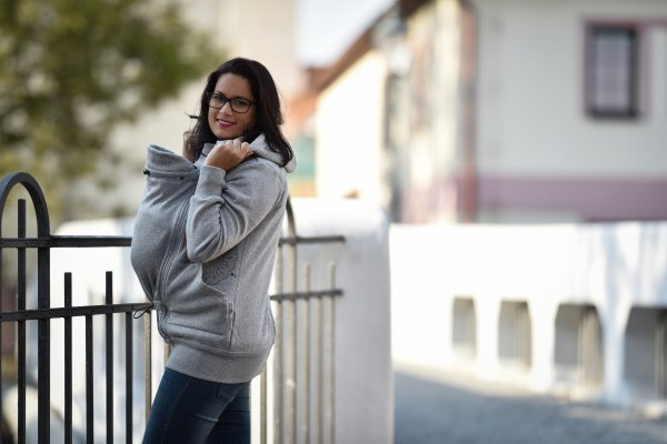 Kapucňu dospelého môžete pomocou patentu pripnúť k límcu aby neprekážala dieťaťu nosenému na chrbte.
