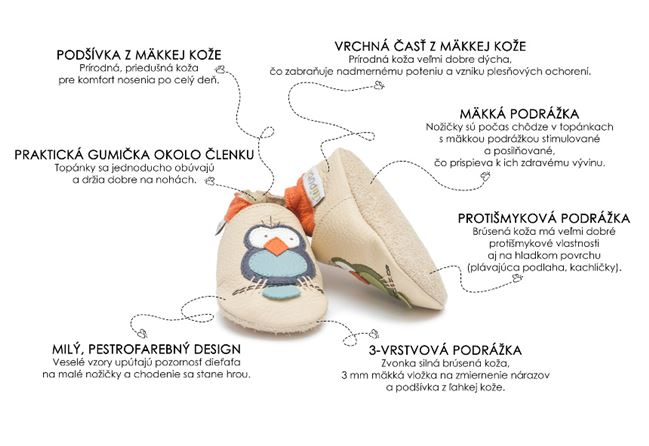 Vyrobené zo 100%-ne bezpečnej, mäkkej, priedušnej prírodnej kože. Prírodná koža veľmi dobre dýcha, preto sa malé nožičky v topánkach nespotia.
